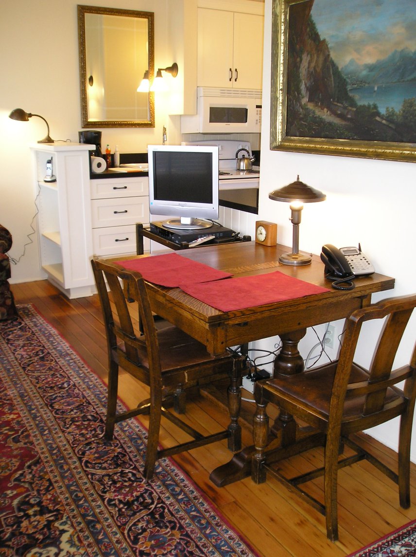 Fully-furnished cozy one-bedroom apartments occupy the upper story of a restored 1893 OSU Classroom building. Huge windows, 12-foot ceilings, wool rugs and natural wood floors highlight the entry, bedroom, living room and kitchen areas. Complete amenities include new bathrooms, dishwasher, private laundry, flat-screen TV with cable; wireless internet; private phone and individual central heat and AC. The adjacent restored 1907 OSU Incubator House is now a 600-square foot private studio cottage, complete with TV/cable, wi-fi, laundry, phone, infloor radiant heat, new kitchen and bathroom, fully wheelchair-accessible. View interior photos of each apartment and studio.